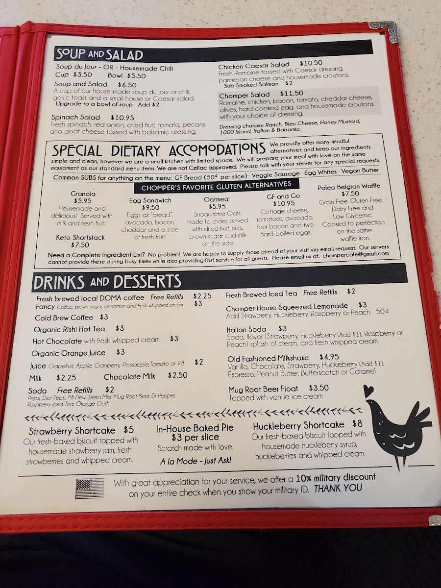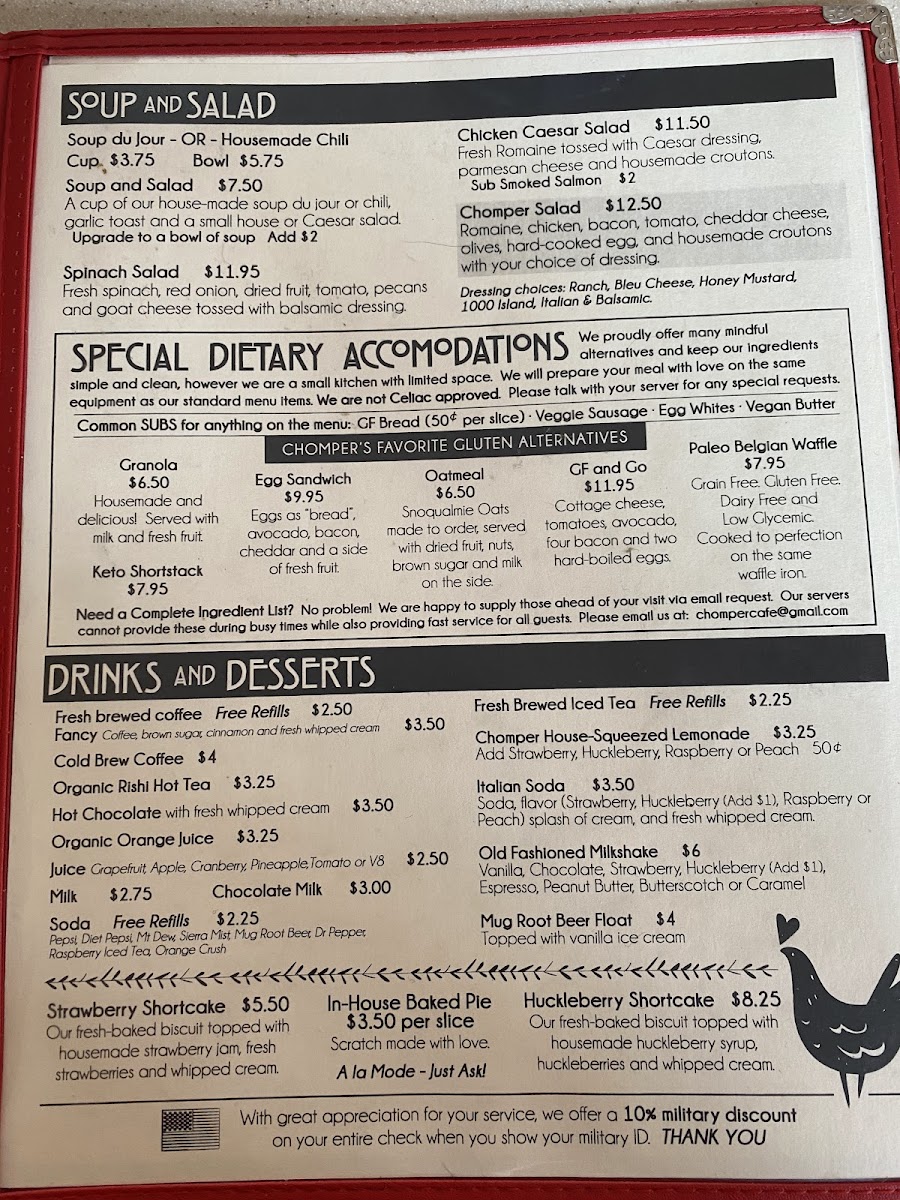 Welcome to Chomper Cafe, a beloved breakfast haven located at 2345 W Prairie Ave, Hayden, ID. This locally owned gem has garnered rave reviews for its hearty menu and welcoming atmosphere, perfect for families and food lovers alike.